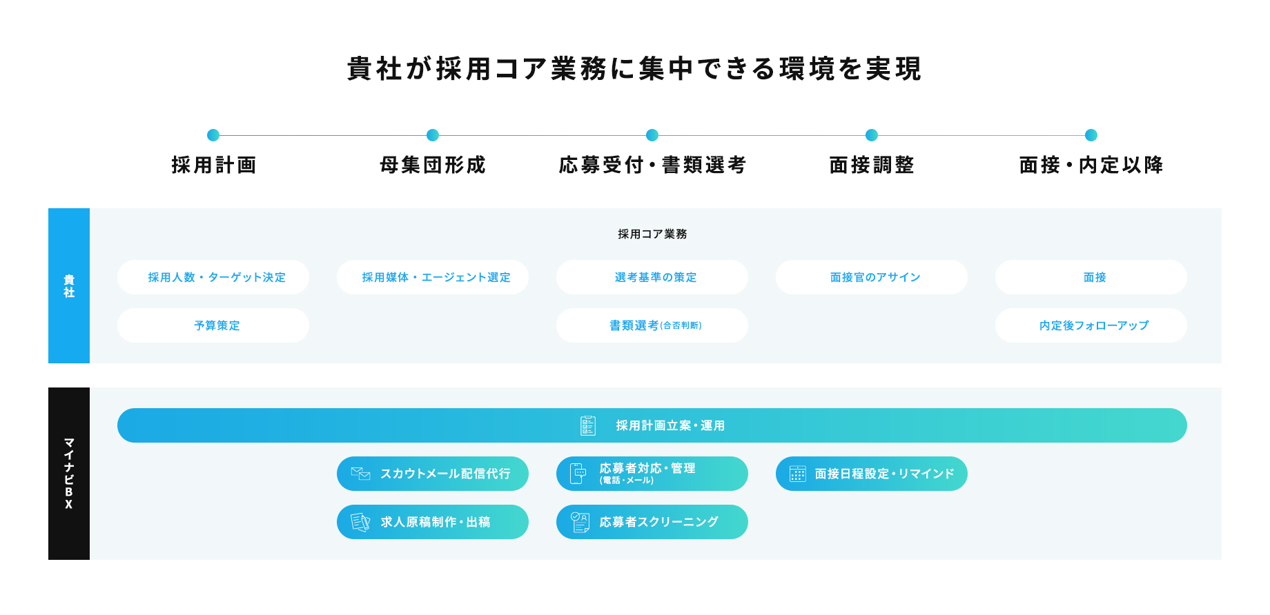 採用担当者が集中すべきコア業務に専念できるよう伴走します。